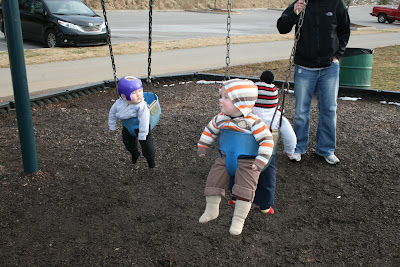 On Sunday we had almost 50 degree weather so we took the boys to the park and they got to swing for the very first time! It was so much fun to finally do something like this with them. Prior to winter, the boys were just to young to do this stuff, it made us realize how much more fun this spring and summer will be with the boys! When we were done we loaded everyone up and it was just the best feeling to do this together as a family. Some of you might think this sounds weird, but having triplets doesn't allow for us to do a whole lot unless we have a third person. The boys aren't walking yet or even crawling so it is really tough to lug 25 lb boys around and keep them all happy at the same time.